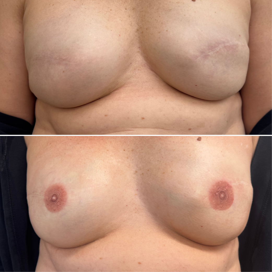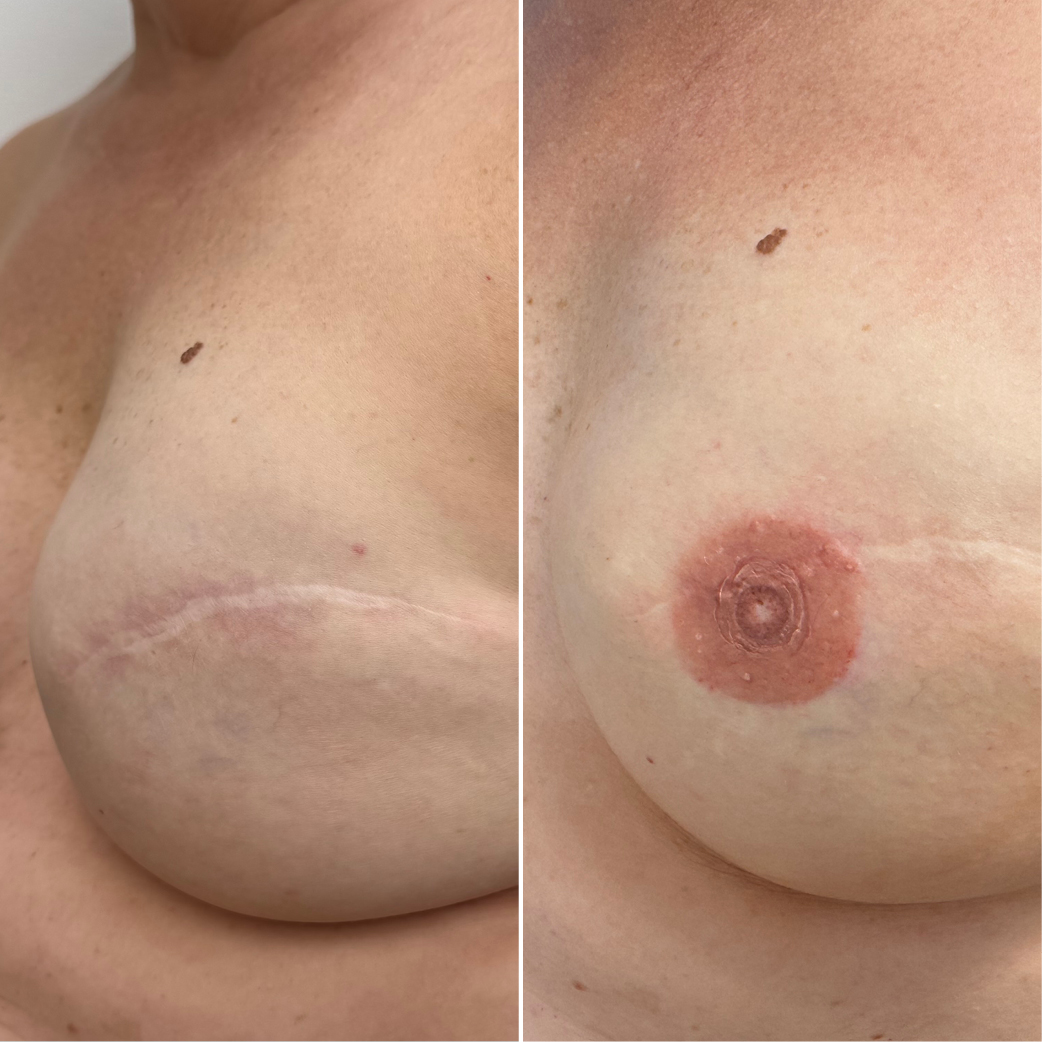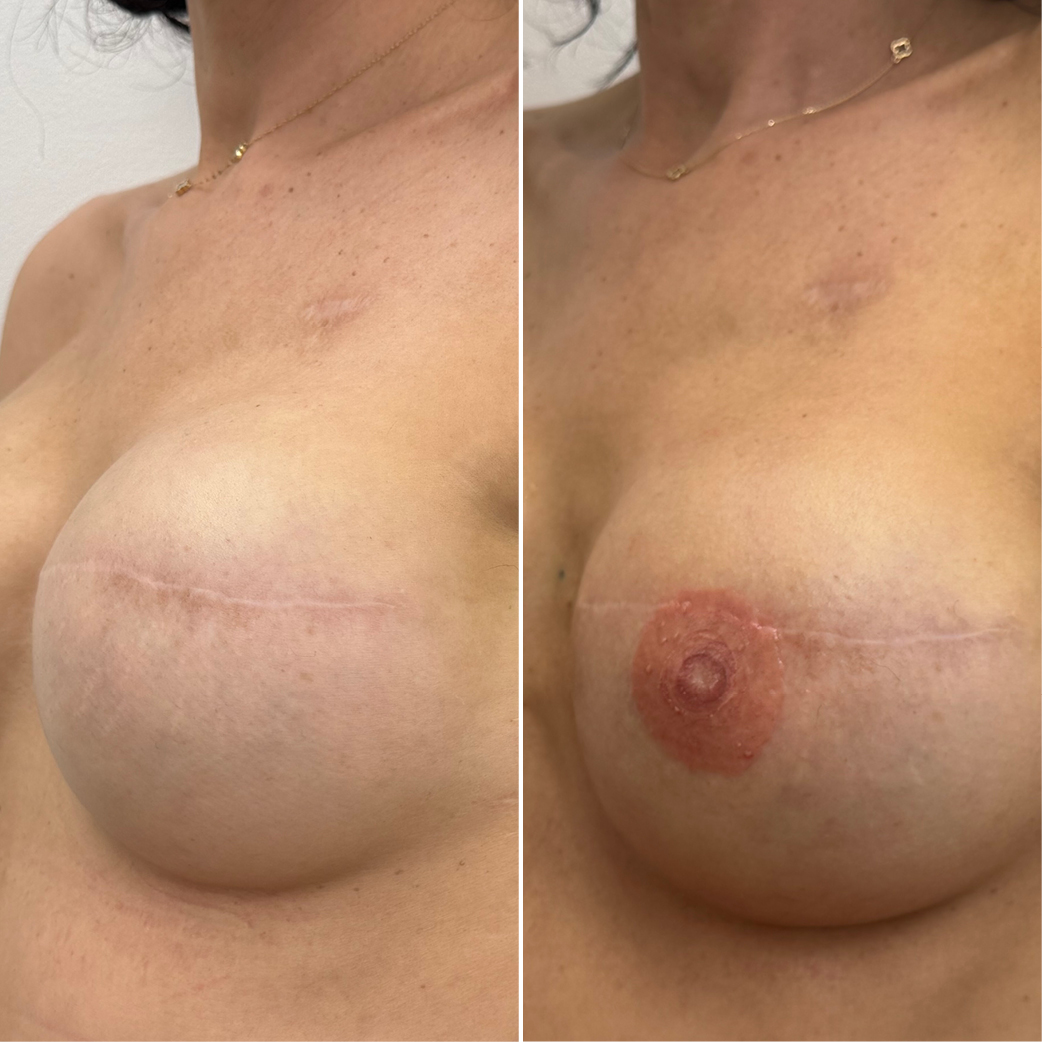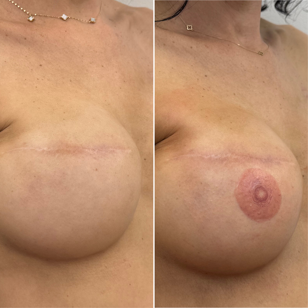 Before and after scar camouflage (right) and 3-D nipple tattoo (left).  Right nipple had partial necrosis resulting in  hypopigmentation.  Left nipple was surgically removed.  No nipple reconstruction on the left.