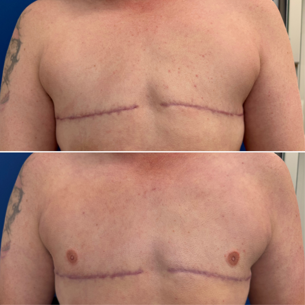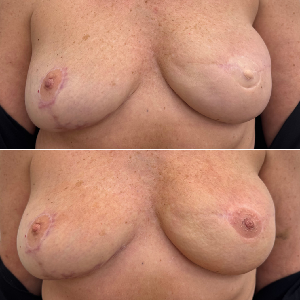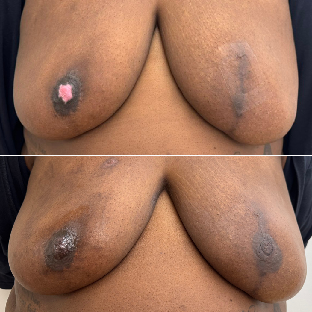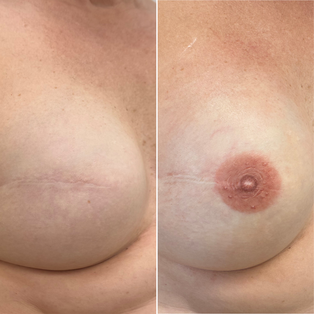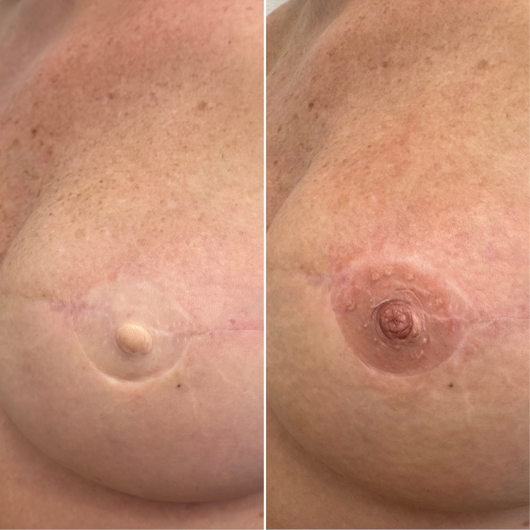 Before and after scar camouflage (right) and 3-D nipple tattoo (left).  Right nipple had partial necrosis resulting in  hypopigmentation.  Left nipple was surgically removed.  No nipple reconstruction on the left.