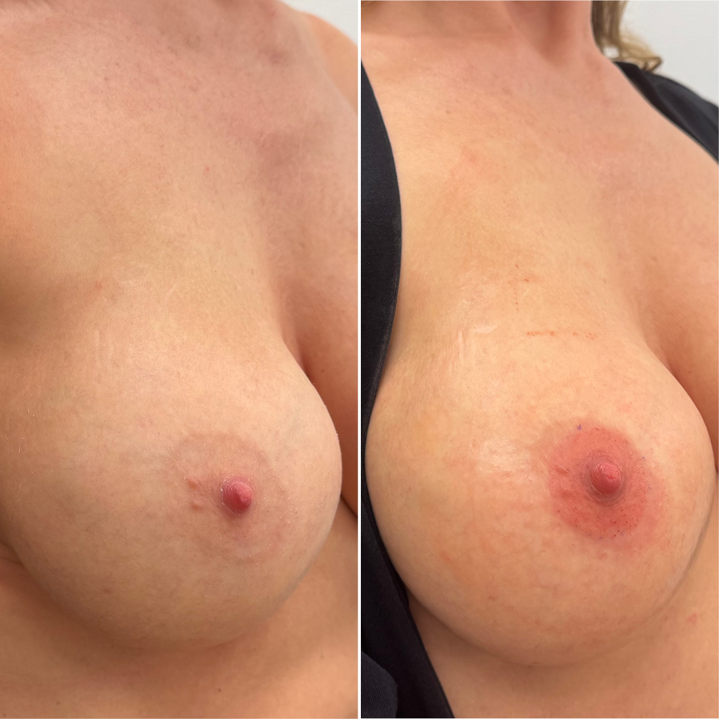 Bilateral tattoo of the areola to restore natural pigment that is lost due to age and/ or surgery.  Color softens as the tattoos heal.